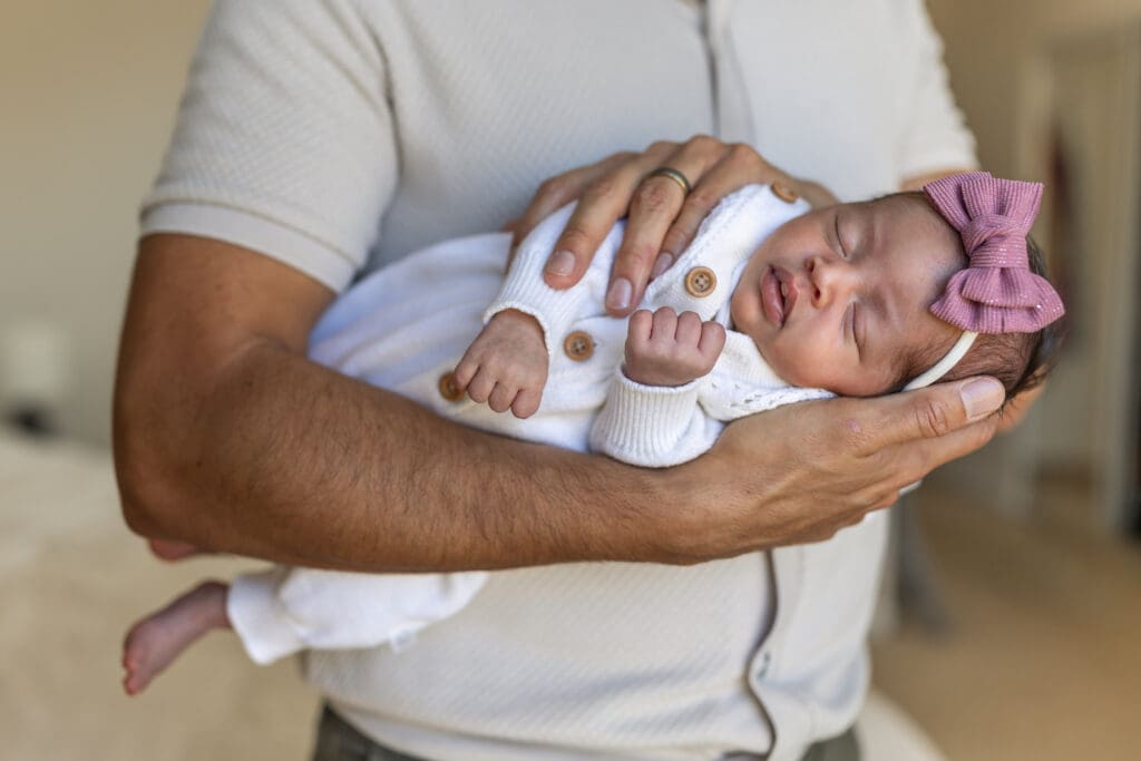 On the day of your session, open all blinds and curtains to let in as much light as possible. Turn off overhead lights, which can create unwanted yellow tones. As your San Diego newborn photographer I’ll guide you, but bright, airy rooms are ideal for capturing your baby’s delicate features and your family’s connection.